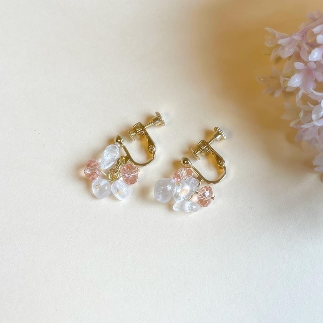 艶やかな「水晶」と繊細なガラスビーズが 優雅に揺れるイヤリング・ピアスです! 水晶はその透明感で、 まるで氷のような清らかさを感じさせ、 ガラスビーズは薄ピンク色で 着用している方を優しい雰囲気に演出します。 シンプルながらも存在感のあるデザインは、 カジュアルな日常使いから特別なシーンまで 幅広くお楽しみいただけます。 コーディネートに 華やかさを添えるアクセサリーです! ちなみに、私自身も軽やかな付け心地を 大切にしており、 長時間の着用でも快適さを追求した 軽い素材にこだわっています! 天然石:水晶 ビーズ:ガラスビーズ 金具:イヤリング(メッキ) ピアス(サージカルステンレス)